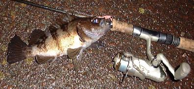 | 1月22日 娘がカゼをひいて、翌日のスキーが中止・・・・。 こりゃ行くしかないでしょ・・・ ということで、PM11:00 川崎の浮島、水江町付近へ出かけた。 いつもFと、どちらかのクルマで行くのだが、出発時間や、お互い の翌日の予定などもあり、現地集合。 ちょっと小雨。 某岸壁 「いつものところ」 で落ち合う。 着いてみると、新車を購入したFは、さっそく後ろのハッチを空け そこに腰掛け、ゆったりタックルの準備をしていた。 こっちも早々にタックルの準備をし、イザ出撃! 潮は大潮の下げイッパイ。いつもは水没しているゴロタがカオ を出している・・・。 最初は、エコギアの「シラス」で攻める・・・・。 しかし、アタリなし・・・ 寒さも増して、キビしくなってきたころ、やっとアタリ・・。 しかし、水面でバレた・・・・・。 気を取り直して、同じところにもう1投。 するとすぐヒット。 けっこうイイ引き。 20cmといったところか・・・。 ![]() Fも1匹ゲット。 ![]() その後、2人で、手を変え品を変え、20cm〜23cm を11〜13匹ゲット。 ここのメバルはけっこうデカイのだ。 寒さもシミてきて上がろうと、あと1投・・・そしたらキました。 シーバス・・・・23cm・・・こりゃセイゴだぁね・・・。 でもシーバス。