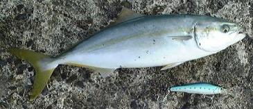 5:00AM 下田 福浦堤防へ。 下田最終日、メッキと遊ぶためのチップミノー が無いため、 チャレンジの意味も含めて初めての場所へ。 車を止め、3分 ほど歩き堤防に着く。 着くなり、堤防手前の人が ワカシ・・35cmくらいを上げている・・・ こりゃ期待していい?? 堤防は平日だというのにけっこうな混み様。 手前の方が空いて いるので、そこでキャスト開始。 アイルマグネット 12cm。siking。 と、海を見ると・・・アオリがいる!それもけっこうデカいのが 2匹・・・。 急いでエギに替えるが、いなくなってしまった。 また、アイルマグネットに替え、キャスト開始。 またまた 海を見ると・・・アオリ! 急いでエギに替えるが、ま たいなくなってしまった。 そうしているうちに、隣の人にソーダガツオが。 がぜんやる気が出てきた。 そして数投目。ストップ&ジャークを繰り返していると、 ガツーン! キました! ドラグがジージー。 沖に向かって走り出す。ドラグをキツめてなんとか寄せてくる。 手前まで来るとまた走り出す。 タモがない・・・。 ヤリトリを繰り返し、サカナが弱ったところで、 よっこらしょ と抜き 上げた。 40cmのワカシ・・・イナダ・・・。 ![]() その後キャストを繰り返すと足元6〜7メートルくらいのところまで ワカシがチェイスしてくる。 けっこうドキドキだぁ 。 しかし7:00 Time Up 宿のおばさんにあげようと思ったが、やはりここは下田・・・ 珍しく ないらしく「氷あげるから、持って帰って食べな。」 ここらへんでは、このサイズは1匹丸のまま、醤油、みりん、生姜で 甘辛く煮るらしい。 美味しいらしい・・・。 しかし、サシミで食べちゃいました。 | |