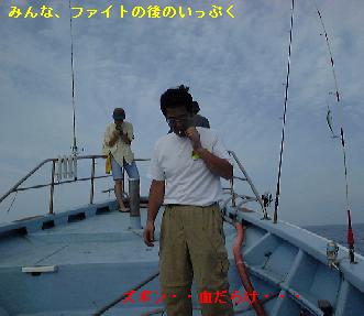 次、そしてその次の群れ。 このとき船中最高の 115Cmが上がった。 取り込むのに15分はかかってた。 まさにお化け! 数個群れを求めうちに船の後ろでキャストしていた僕にヒット! 真っ青のきれ いな魚体がジャンプ! そのとき船長がクラッチを切り、移動しようとした。 「船長、ヒット!!」 その瞬間 ”ブチン” ・・・・・・リーダーごと切れた。 「あぁ、ごめん。もっと早く言ってよォ。」 ・・だって・・・ヒット直前だったんだもん・・・ まぁ、ドラグの調整がアマかった ボクのせいもあるので文句は言うまい。 しかし、あの魚体はきれいだった。 急いでラインシステムを組み直す。 そして、まぁまぁの型がマスターにかかった。 ずいぶんタモ入れに苦労して上がっ た。 タモ入れはEっちゃんだった・・・・。 また移動。ペンペン の嵐。 しかし、ヒットしたときの衝撃はナカナカのもの。 これが実にオモシロイのだ。 ワカシ(20cm)もヒット!! そしてなんだかんだで群れが見えなくなり、TimeUp。 船を下り、荷物整理。 マスターの店まで直行。 3:00PM前には渋谷についていた。 数上げたシイラのうち、2〜3匹をキープ。 さばいてみると、胃からは イワシそして、ワカシが出てきた。 あの船長が言っていた「でかいルアーを使え!」というのは アタっていたのだ。 そして、ムニエル・・・・ウマいんですよ。これが。 うちの子 はバクバク ペロリ でした。 なぜ、みんなリリースしちゃうんでしょうか・・・。 1匹くらいキープして、お土産にすれば、ビールのツマミに ちょうどいいですよ。