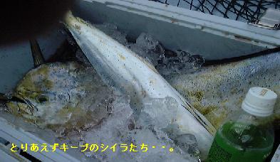 ■場所 沼津 ■潮 ? ■実釣時間 6時間 ■天候 晴れ ■気温 あつい ■水温 ■釣場 駿河湾 ■ロッド 8ft ■ライン 20lb リーダー30lb ■ヒットルアー アイルマグネット 他 ■Fish シイラ「今年こそ行こうよ、駿河湾。」 「そうだね。」 Fとこんな会話をして、はや2ヶ月。そろそろ、シイラの季節。 「いつにしようか・・・・」 「じゃぁ7月8日!」 沼津の多比港 明栄丸さんへお世話になることにした。 今年は少し気温が低く 心配ではある。7月にはいると、各情報誌には 『相模湾シイラスタート!』とか デカデカと載り始めた。 入ってくる情報は相模湾ばかり。ネットで「御前崎では そろそろ」といったカンジ 。 心配はしていたが、意外と好釣果だった。 マスター、Eっちゃん、Aくん・・・・ 総勢7人で出かけました。沼津。 現場に3:00前、到着。仮眠を取るハズだったが、結局ネムれず、5:00前の出船 とな った。 海は凪いでいて、船は滑るように走り始める。 駿河湾に出ると、いよいよ「群れ探し 」。 探して、探して、探して・・・・・。 1時間ほどたっただろうか・・・ 船長は減速。 「鳥がいるから、やってみて・・」 キャストするが反応なし・・・移動開始。 すると程なく、鳥、流れ藻 を見つけた。 Aくんがキャスト・・・「追ってくる!」 Fが・・・「ヒット!」 僕も、Eっちゃんも、マスターも・・・・。 始まってしまった・・船中フィーバー・・・。 次々にヒット・・・ しかしみんな、属に言う60〜70 のペンペン。 唯一Eっちゃんが90cmくらいのを上げるにとどまった。 しかし、60〜70cmでも引きは強い!この第1弾の群れで皆がシイラをゲット。 あとはサイズアップを狙う。