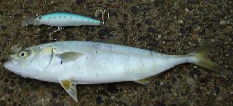 ■場所 大洗 ■潮 ? ■実釣時間 3時間 ■天候 晴れ ■気温 あつい ■水温 ■釣場 大洗 ■ロッド 9ft ■ライン 10lb ■ヒットルアー アイルマグネット ■Fish ワカシ青物スタート?!?! 待ちに待った太平洋高気圧。 先週不発だったが、ネットの情報によると、各地でワカシ、ショゴ の報が伝えられている。 ホームグラウンド・・・大洗も例外ではないはず・・・ そう思うと 落ち着かず、とうとう来てしまいました。大洗。3:30着。 ムスメとの約束で、9時には戻らないといけないので、ENDを 6時30分に決め、いざポイントへ。 先行のグループに様子を聞くとキスとアジが出ているそうだ。 キャスト開始。 しかし・・・先週から、そう状況は変わるものでもない。 海面に目をこらしつつキャストを続ける。 5:00AMチョイ前。 エサ釣りの人にカンパチが出た・・・15cmくらいの 子カンパチ。 そして、それに続いて23cmのカンパチ が出た! がぜんやる気が出てきた。 その数投後、ルアーの後を追ってくる数匹の魚影を確認! 戻っていった先の方に目がけてキャスト。 そしてヒット! く〜〜っ この瞬間を待っていました・・・。 寄せてくると、ワカシ! 抜き上げる。 27cm。 今年の記念すべき、陸っぱり初青物! 感動の対面と、フックはずしに手間取り、タイミングを逸してし まった のか、群れはどこかへ行ってしまったようだ。 その後ネバったが1度群れがルアーを追いかけてきた(後をついてき た) にとどまった。 6:40END 片付け、一路家を目指す。 連休の初日、常磐道の下り線は大渋滞。 上り線はスイスイだ。 8:40 家着。 その足でムスメを夏祭に連れていくことができたとさ。