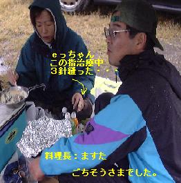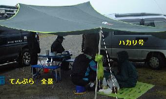 1ヶ月 釣りに行っていない・・・もう、干からびてしまいそうだぁ・・・・ そんななかマスターよりお誘い。 「今度の連休、 佐島でボート釣りして”天ぷら”しよう・・・」 10/6 太平洋上に台風発生!!このままだと 天ぷらに直撃!!! あぁぁ・・。 10/7 曇りの中、息子の運動会は無事終了。 台風も少しソれた! これなら行ける!。 翌8日2:00AM 起床。 佐島へ向けて Let'S Go!。 4:30 佐島・海楽園着。 朝食をとろうと、待ち合い所に入る。 するとテレビがついていて、アメリカの 報復攻撃第1波 を伝えてい た。(トマホーク50発!!!) 一方 日本の三浦、佐島で、僕は お茶すすりながら朝食、一服。一心地つけてるボクいる のであった。 平和あってこそだぁね。 タックルを準備に車に戻る。しばらくするとマスター、ハカリさん到着。 総勢9名。身支度を整え、4隻のボートに乗船。 6:00AM 出船。風は吹いているので、起きには出られない。 僕はハカリさんと同船。 行程10分くらいの岸よりで開始。 ブルブルと微妙なアタリ。 上げてみ ると まるでワカサギのようなピンギス!! ピンギス・・・・・またピンギス・・・。 その後あまりパっとしないので、移動。 そして巨大鳥山発生!!! なぜかルアーが登場!!キャストするが反応 なし・・・・ そこに遊漁船が突っ込んできて見事に鳥山は散った。 ルアーはあえなく惨敗。 底物に戻る。 移動、移動。 メゴチ、トラギス(?) 、チダイ、イイダコそしてハゼ、ハゼ・・・・ キスがなかなかこない・・・・見事な雑魚五目!?!?! ハゼが多い・・・ビミョーなアタリが頻繁にあり、サカナもちっちゃい。 一人でボートに乗っているときと違い、同船者がいる、いろいろ 会話があり、厭きない。 (しかもハカリさんなので・・・) 会話が途切れると、ハカリさんはネムくなってしまうのだ・・・会話・・空歌・・沈黙・ ・・釣り・・・の繰り返し。 カゼも強いし、小雨も降ってきた・・・カッパ持ってきてよかった・・・。 ハゼと遊んでいたら、集合予定時刻の12:00になった。 各船もそろそろ上がるようだ。 餌も半分なくなったのでとりあえず一時帰還。 岸についてハカリさんが無線でTAOさんと交信・・・ するとマスターから無線が入ってきた。 「自衛隊堤防の先で転覆しているボートがある!!」 急いで船屋の人に伝えた。おっちゃんがソッコーで船を出す。 普段愛想のいいおばちゃは真顔になって 「あっちのほうは山がないから吹くんだよね・・・あぶないって言ったのにねぇ ・・」 15分後、 船にボート、お客さんを乗せて戻ってきた。 「無事」でよかったぁ・・。 雨も本降りになって、みんな上がってきた。 天ぷらのために みんな普段はリリースするようなサカナ(どんなんだい??)まで キープしてきた・・・・。 これはどうにかして天ぷらするしかない・・・ 僕のクルマにはタープが常備(?)してある・・・・ 秋谷港に移動して、タープ張って天ぷらすることに決定!!