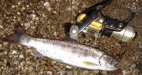 8/25 前日 鳥井原のギョーザ屋でMと飲み、そのときに教えてもらった マル秘ポイントに入渓。 かれこれ20数年前、アブラハヤを釣りに訪れていた場所。 昔の記憶をたどりつつ、川に到着。 あまり期待せずキャスト・・すると数匹のサカナがチェイスして くるでないの!! そして2投目キました ヤマメ!! 18cmほど・・・昔のボクなら迷わずキープだが、ここは写真 に収めリリース。 そして、釣り下る。 瀬からトロに変わるそころでにライズを見つけたので、遠方より キャスト。そしてまた同じサイズのヤマメがヒット!! これもリリース・・・。 あれちっちゃい? アブラハヤ・・・・。 そしてまた釣り下る。 アヤシイポイントにキャストするとキました またまたヤマメ!! 26cm!! あれあれ? 様子がヘンだ・・・サカナいるじゃん。魚影濃いじゃん・・。 ケータイにMからTEL 「どこにいんの?」 「○○から入って、上の方。石垣が見えるとこ」 「じゃぁ近いね。まってるわ。」 Mと合流するまで4尾きゃっち! その後2人で釣り下るが、チビヤマメのみ。 正味1時間の間に 都合5尾のサカナとご対面することができた。 キモは大雨後のダムの放流・・・・。
