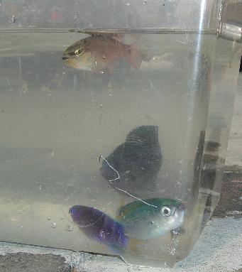 7月3日 奥の誕生日である。 「海いくべ。泊りでいくべ。」 ということで西〜南伊豆へでかけることになった。 例年であれば6月の初旬から海へ出かけ、この時期はもう日焼けしているのだが、 今年は、パニくりシゴトでなかなか出かけられていない。 前日ヘロヘロになってき朝6:30出発、首都高、東名は「渋滞」・・・で沼津を抜け たのは11:00。 狩野川方水路経由 三津〜西浦〜戸田で12:30。 宇久須のガラス工芸館で、カミさんと娘は約1時間半に及び、物色。 天気は良好。息子は「海入りたい〜」が、水温も低いし、シャワーの準備もないこ とから肝心のカミさんと娘は×。 じゃ、何して遊ぶ・・・? 「釣じゃぁ〜!!」 ということで、昼飯を買い込み田子で竿を出すことに。 子浦・・戸田や、土肥に比べると人も少なく、車横付けポイントもあり、イイ。 息子とノベ竿にトリックサビキで開始。 コマセを撒くと、青いスズメダイがたくさん寄ってくる。 早速かかりました 「スズメダイ」。 ちっちゃい! 「釣れる」となったら、カミさんとムスメは面白がって寄ってくる・・。 竿は一本。順番順番。 ムスメはサバの強烈な引きに「おぉぉぉお〜・・!」 カミさんは椅子を出して「飲み」に入った。。。うらやましい。。 天気は曇り、寒くもなく、少し暑いくらい。 「青色」のスズメダイは釣り上げて水槽に入れると、色が黒くなっていく・・。 青いままのやつもいる。 竿はムスメと息子の順番制。 サバ、タカベ、ネンブツダイ、スズメダイ・・・ 鑑賞用 水槽・・・