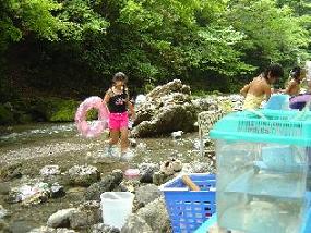 8/8 Kさんちと川に行ってバーベキューをすることになっていた。 向かったのは名栗川。せせらぎキャンプ場。 9:00現地着。基地を設置して、炭を起こす。 川はというと・・・浮き輪を身につけた「カワガキ」でいっぱい・・・・ 息子と娘とK子を釣れて下流にガサ入れに向かった。 約200M・・・ 採れたのは、ハヤっ子、シマドジョウ、カジカ×2。 せっかくでっかい網を購入したのに・・・。 2年前にきたときはハヤがバシバシ取れたし、ヤマメも採れた・・ ん〜 シブイぜ。 昨日釣ったカサゴとアジを網焼きで堪能。 ビールもウマいし。 そして、潜っていた息子が「サカナいっぱいいるよ・・」 そして始めた「あんま釣り」・・・ やはり、あんま釣りは最強・・・ 体調5cmくらいのまでかかる。 しかし、どういうわけか、エサとなるサイズのカワムシが 採れない。 大きな漬物石10っこひっくり返して、採れるか採れないか・・ といったところ。 季節か? 人が多すぎか? 食って、釣って、遊んで・・の繰り返し。 水槽で観察。 そして、16:00。撤収。 静かにリリース。