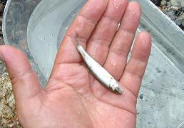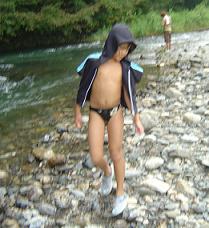 9/3 もう夏も終わり・・・・。 娘も部活は休み。 行く夏を惜しんで、 海?プール?川? 最近の情勢から見て・・川でしょう!! というわけで10:30 遅い出発。 いつもの粟野川。 買出しをし、12:30現場着。 少し増水気味。 そんなことにはお構いなしに川に入る。 「つべてぇ〜!!!!」 そして、始める・・あんま釣り。 例によって子ハヤが釣れる。 こんなのから