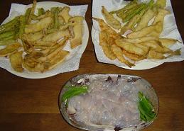 と、隣の人・・・なんか、格闘してる・・・ 格闘の末、上がってきたのは 「ヒラメ!!」 \(◎o◎)/! ソゲ級ではあるが・・・・ ヒラメの口元にはシコイワシが・・・・ シコイワシが回遊してきており、仕掛けを落すとそれにイワシがかかり、 底まで付けたら、ヒラメが食った・・というパターン。 それをみていた、トナリのガキも、イワシをつけてやり始めた。 そしたら・・きた・・・ソゲ。 (ーー;) けっこうソゲの魚影が濃いのか?? キスのプルプルしたアタリを楽しんで、 13:00 終了。 少し早い気もするが、このくらいがいい。。 帰港。 顔を洗って、身支度をして、味噌汁をご馳走になり、帰途へつく。14:10。 首都高順調。16:00には帰着。(早い!!!) キスはテンプラ。 カサゴはデカいのは刺身。 中型のは、開いて干物にしています。。。 テンプラとサシミは、大好評!!完売!!。