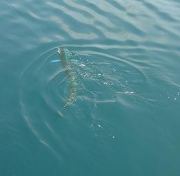 右舷 へ着座。 隣には 調布からきたという 「Bergman」さん というアメリカ人の方。 最初、英語で話しかけ、それに答えてもらっていたが、 なんか日本語ぺらぺらじゃん・・・・・・・・・・・・・・・・・・・・ (^_^;) せっかく 英会話フィッシング できるかなぁ と思ったのにな・・。 なんやら、小田原 とかにもひょっこりいくらしい。 「おだわら ○○丸もいく。 ノりあい よやく すいてていいよ。ここは こんでる。 でもきょうは よやくいらない。すいてるよ。」 だそうだ。 そりゃ、ソロで釣り船に乗るくらいだから、日本語できるはずだぁな。 出船15分。平塚沖の潮目からキャスト開始。 しばらくノーバイト。 4流し目くらいから、シイラが見えるようになる!!! 大磯沖。 中規模の群れ。前方にキャストし、リトリーブ直後「ヒット!!」 (;`ー´)o/ ̄ ̄ ̄ ̄~ >°))))彡 やた! ひさしぶり!!この感触!!! 突っ込む!! ドラグが出る!! しししかし!!次の瞬間・・プーン・・・ 「切れた!!!!」 結び目がクルクルになってもどってきた。「アマかった!!」 ルアーももってかれた!! 10キャストしてない「ZipBait・・」あぁぁ・・。 (ToT)/~~~ 「さんねーン、どらぐきついね。」 By ばーぐまん。 はぁ・・。 さて、気を取り直し、キャスト開始。 日も差し、いかにもシイラ ふぃっしんぐ というかんじ!! 日焼け止め を塗り塗り、キャストを続ける。 鳥山などはなく、浮遊物もまばら。 潮目でシイラを見つけて、キャストしていくといった状態。 それでも、船中では 今日イチバンの122cmが上がる。 船の状態。