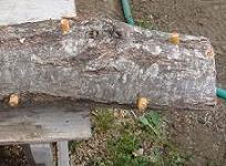 ホダ木に、シイタケの菌糸のコマを打ち付けていく。
