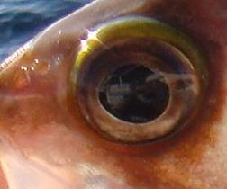 メバル・・目がデかく、目にオイラと船の側面が映りこんでいる。