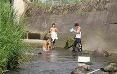 湯川。鳥井原堰堤 。 堰堤下のカワガキ。 このときはちょうどよい流れが堰堤下にできていて、