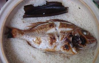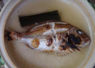 鯛を塩焼き。土鍋に3合のコメと昆布を敷き、水と約100mlのタイの潮汁、塩少々、