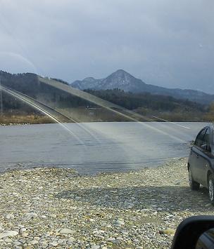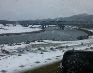 昨日の朝、雪の平原だった河原、雪で真白だった山々は、雪が完全に融け、増水も