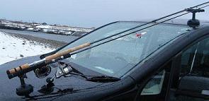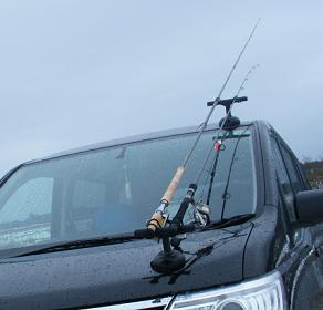 影山さんの長ーいフライロッド。ポイントをRun & Gunするには、このロッドホルダー