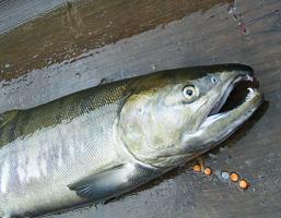 上げてくると、小さいながら、オスのサケ!!