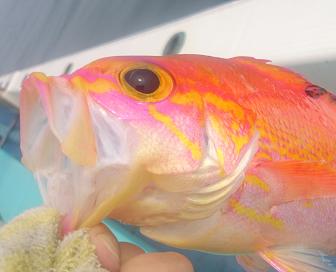 80mの巻き上げを惜しむように、大切に・・上げてくる。なんだか大口を開けて上がってくるピンクの魚体。
