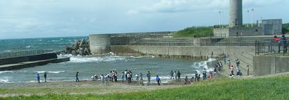 港の西岸では、なにやら、小学生40人ほとの団体が、海に向かってボトルのようなものを