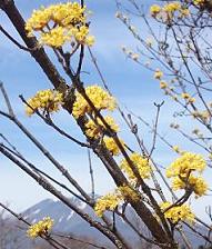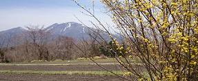 翌日4/9。 暖かい。春である。 黄色のサンシュの花が鮮やかで、その向こうに浅間。